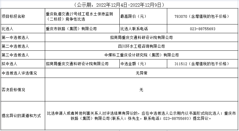 重慶軌道交通27號線工程水土保持監(jiān)測(二標段)競爭性比選結(jié)果公示表