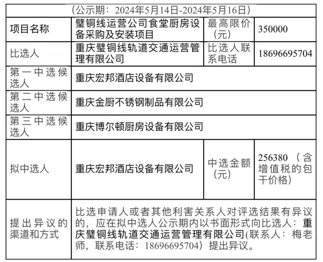 璧銅線運營公司廚房設(shè)備采購及安裝項目競爭性比選結(jié)果公示表