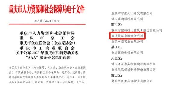 近日,重慶市人力資源和社會保障局、重慶市總工會、重慶市企業(yè)聯(lián)合會(企業(yè)家協(xié)會)、重慶市工商業(yè)聯(lián)合會發(fā)布了《關(guān)于公布2023年重慶市和諧勞動關(guān)系“AAA”級企業(yè)名單的通知》(渝人社〔2024〕49 號),表彰了一批有力維護和諧勞動關(guān)系、切實保障職工權(quán)益的優(yōu)秀企業(yè),市鐵路集團南涪鐵路公司榜上有名。