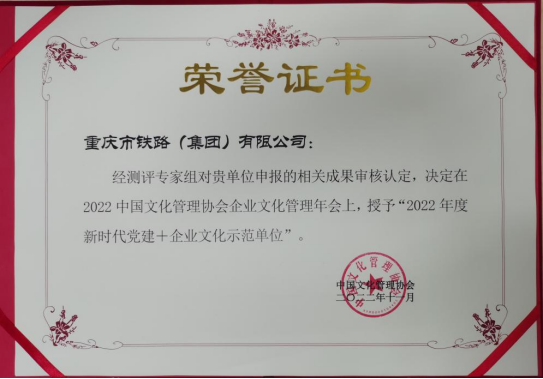 近期,在北京舉辦的中國(guó)文化管理協(xié)會(huì)企業(yè)文化管理年會(huì)上,經(jīng)專(zhuān)家評(píng)選,重慶市鐵路集團(tuán)榮獲2022年度“新時(shí)代黨建+企業(yè)文化示范單位”榮譽(yù)稱(chēng)號(hào),集團(tuán)黨建引領(lǐng)高質(zhì)量發(fā)展再上新臺(tái)階。